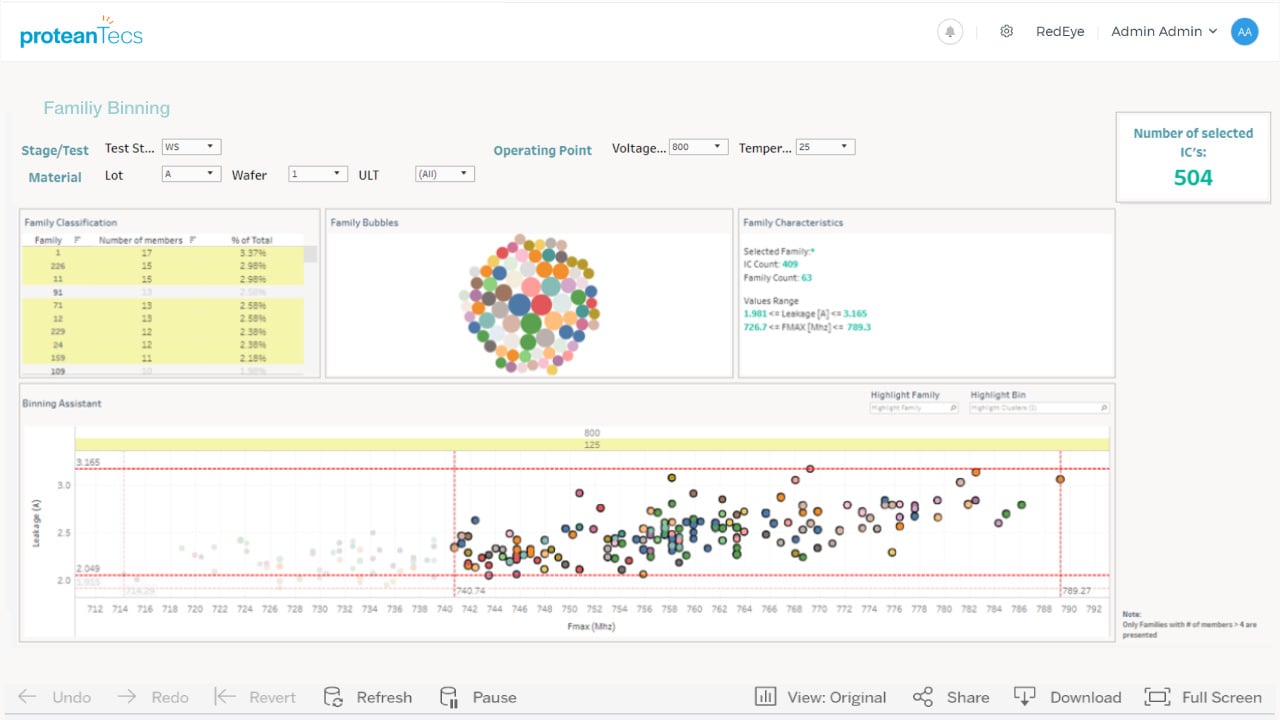 This is much more than simple pass/fail testing that is normally performed at Wafer Sort. Instead, by using proteanTecs’ analytics platform, Proteus™, chips can now be sorted into precise operating categories to achieve very fine binning even at this early stage.