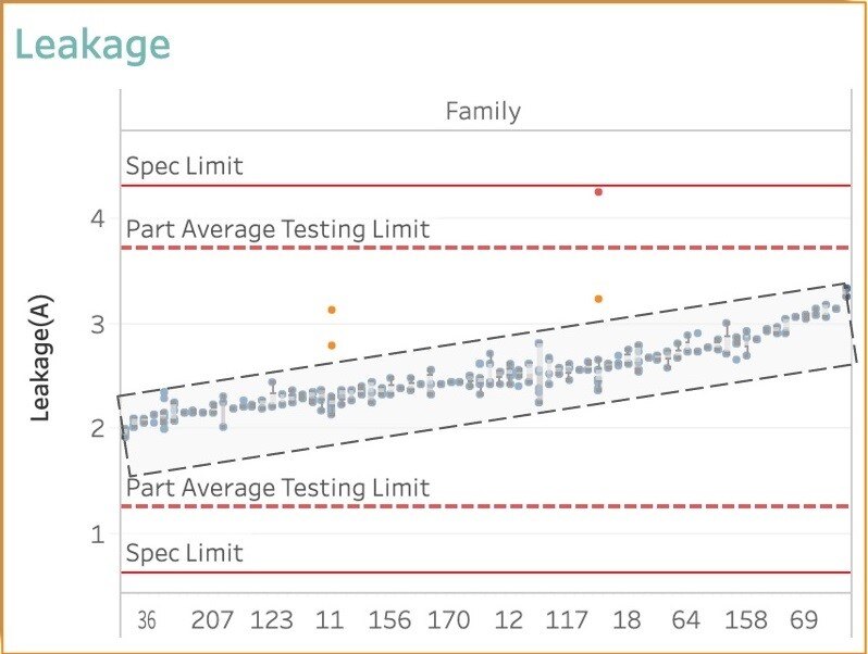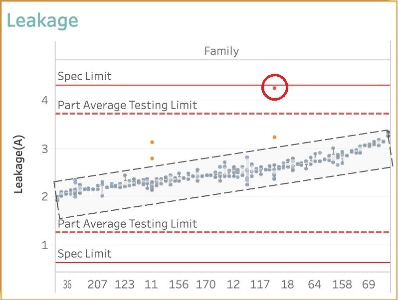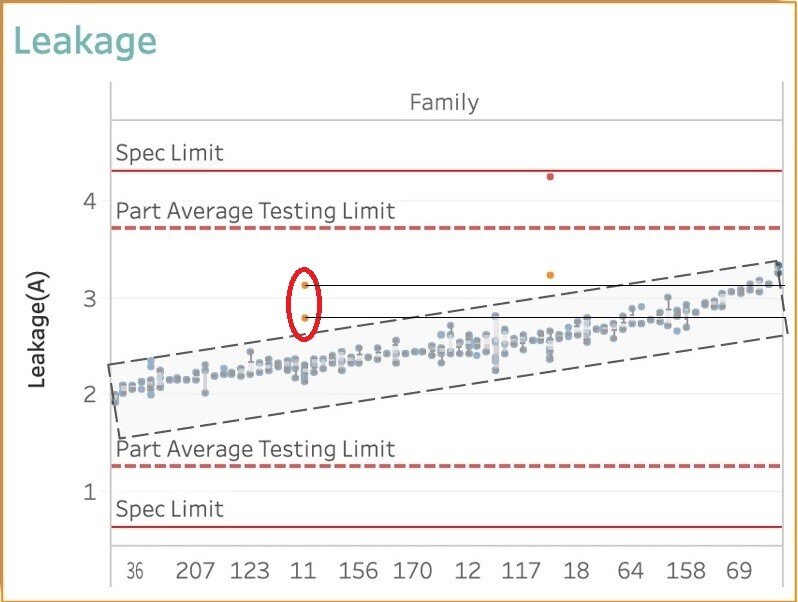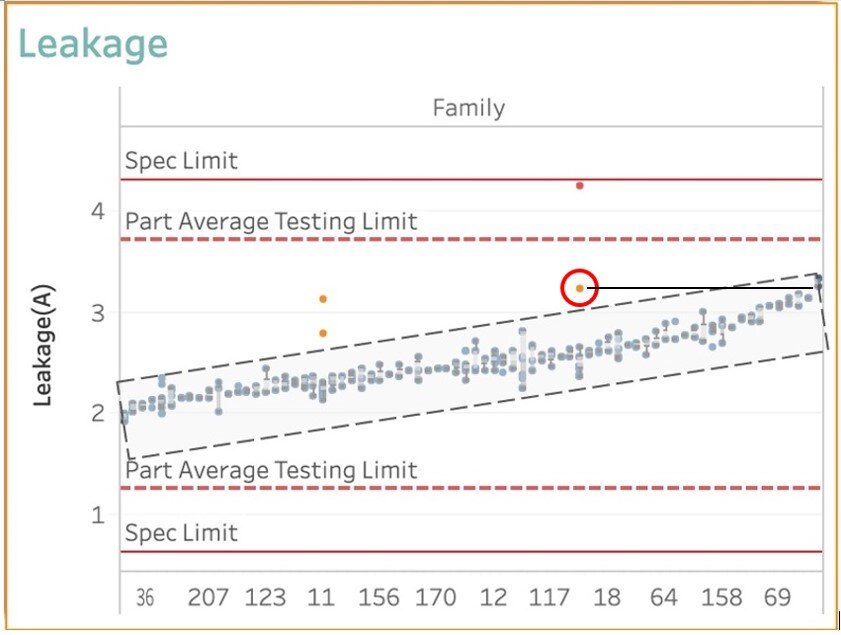 The orange dots are more than 1σ away from the mean – you can see two such outliers in Family 11 and Family 18. The one in Family 18 (circled below) will pass the standard functional test, even though it has a small defect that caused its leakage to be higher than expected relative to its Family. Whatever has caused this one chip to deviate from Family 18 is likely to result in issues later on, and it should be disqualified. But standard functional and structural testing will let it pass since its leakage current falls between the high & low limits, and the defect impact in structural test result will not be detected.