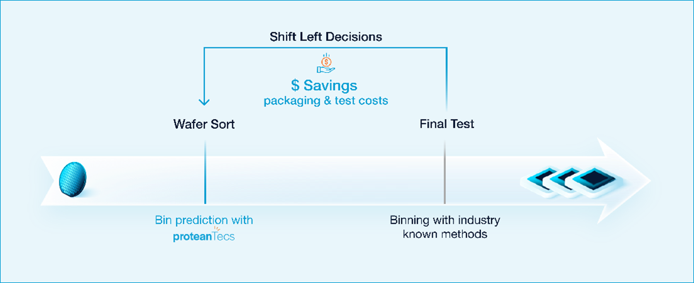 This blog explores how proteanTecs’ shift-left solution leverages deep data from early stages, such as Wafer Sort, and applies advanced machine learning techniques to predict Wafer Sort failing bins and even Final Test failing bins with remarkable accuracy. By identifying and addressing potential issues earlier in the production testing process, semiconductor manufacturers can save costs in packaging, testing, and overall yield optimization.