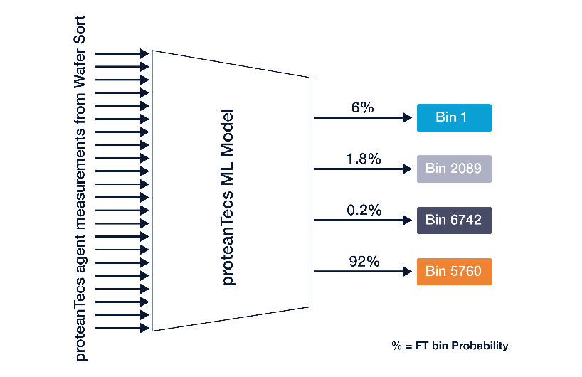 This is where proteanTecs deep data analytics come into play. Based on parametric measurement of on-chip agents, proteanTecs provides advanced analytics during semiconductor production testing. These agents collect detailed profiling data during the wafer sort process, capturing the process variation on the related transistor types and the standard cells most frequently used by the customer. By applying machine learning algorithms to the wafer sort data, it is possible to predict the likelihood that a chip will fall into a specific bin during the final test, specifically, potentially failing bins.