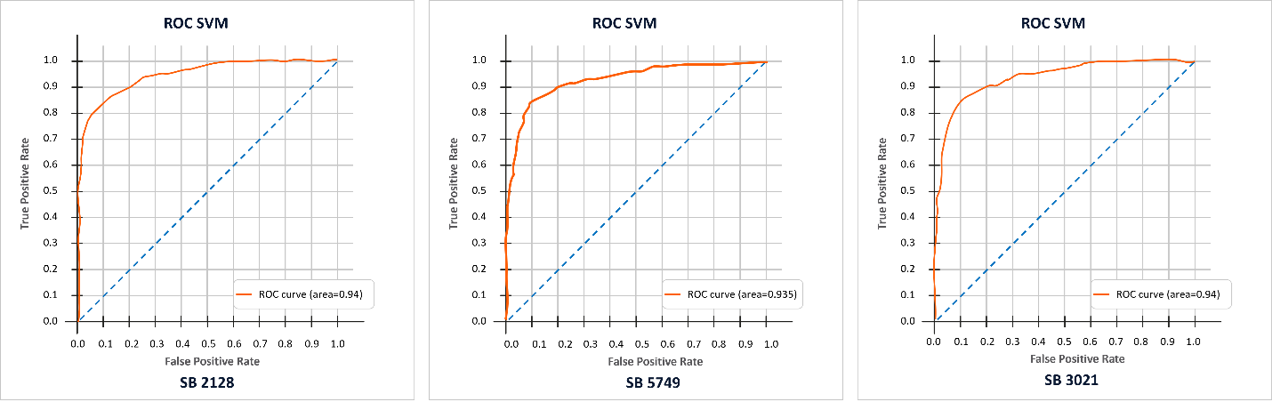 The example below showcases proteanTecs’ shift-left application running during manufacturing testing of a 5nm datacenter compute chip. The ROC (Receiver Operating Characteristic) curves presented in the images showcase the performance of a machine learning model in predicting two specific soft bins: SB 2128, SB 5749, and SB 3021. The ROC curve is a graphical representation of a model’s diagnostic ability, specifically illustrating the tradeoff between false positives (devices marked as bin Pass in final test, but the model marked them as Fail) and true positives (devices labeled as a specific failing soft bin in final test, which were indeed correctly marked as this bin by the model). The area under the curve (AUC) indicates the overall performance. In these cases, the AUC values of 0.94 and 0.935 demonstrate the model’s strong capability in distinguishing chips likely to end up in these bins.